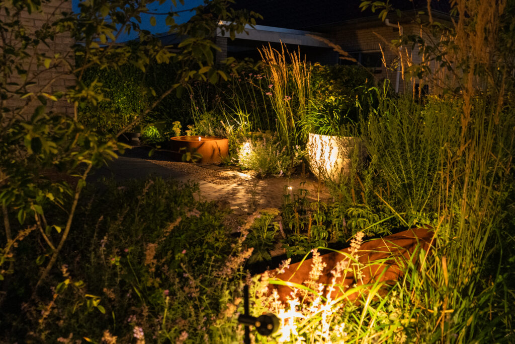 Een strakke en karaktervolle voortuin in Rottevalle met weelderige beplanting en een echte eyecatcher: een cortenstaal waterelement dat direct de aandacht trekt.